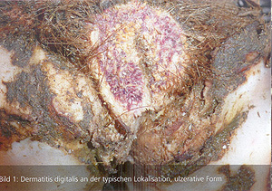 Ursache: Allgemein kann man sagen, sind verschiedene Bakterien für diese Erkrankung verantwortlich. Die Erreger werden in wechselnder Zusammensetzung in den typischen Hautveränderungen gefunden. Offensichtlich unterstützen die Bakterien (Prevotella, Fusobacterium, Streptokokken., E. coli, Staphylokokken, Treponema) sich in ihrer gemeinsamen Wirkung, oft nach Erweichung der Haut durch Gülle und Vorschädigung durch Keime. Die in der Unterhaut sitzenden Treponemen (Keime) sind dadurch gegen oberflächliche Behandlungsmaßnahmen relativ gut geschützt.